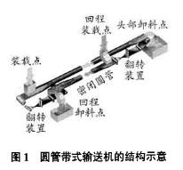 圓管帶式輸送機的結構原理見圖1,在輸送機的尾部通過裝料器給輸送機裝載,輸送帶經(jīng)過尾部滾筒后成為普通輸送帶的平形,用若干組過渡托輥將平形的輸送帶逐漸導向成封閉的圓形截面,從而實現(xiàn)密閉輸送物料。為了卸料,在輸送機的頭部仍然通過過渡托輥的導向,將圓形輸送帶導向成平形輸送帶,在輸送機的頭部實現(xiàn)卸料。理論上,輸送機可以進行雙向輸送物料,但是通常需要增設輸送帶翻轉(zhuǎn)裝置。與其它密閉帶式輸送機和通用帶式輸送機相比,圓管帶式輸送機因其所特有的結構形式,具有明顯的特點。
