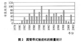 圓管帶式輸送機輸送的物料品種涉及煤炭、糧食、水泥、預制混泥土、工業(yè)灰渣,肥料、礦石、木屑、油焦、印泥等多種散狀物料,服務行業(yè)涵蓋了水泥生產(chǎn)、礦山運輸、加工業(yè)原料輸送、電力設備供煤、垃圾處理等多種工業(yè)應用。從1978年第一條圓管帶式輸送機誕生以來,圓管帶式輸送已經(jīng)發(fā)展了27年。截止2004年底,全球已建設了960余臺圓管帶式輸送機(其中德國的KOCH公司有150臺左右),輸送能力50-4500T/H;總運輸長度達200KM以上;管徑范圍100-700MM。圖2是截止2002年世界圓管輸送機的建造情況的統(tǒng)計。世界范圍內(nèi)圓管輸送機的單機最大長度為5029M,最大輸送量為4500T/H。最大管徑為700MM,最大傾角30°,最大轉(zhuǎn)變角度90°,最多轉(zhuǎn)彎處數(shù)為12個,最大帶速4.7M/S。