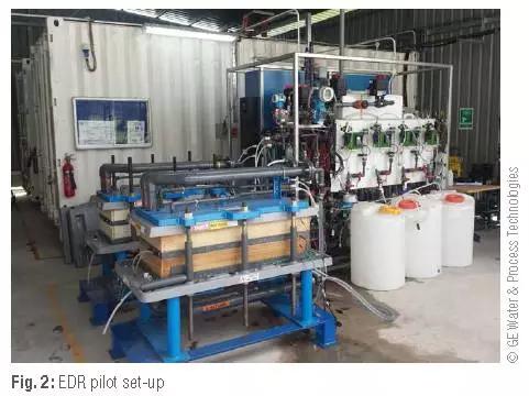 自2014年9月起,在PUB的烏魯班丹污水廠搭建起了一條中試線。試驗采用不同種的離子交換膜和不同的膜間距設(shè)計,以設(shè)計出最合理的EDR反應(yīng)器(圖2)。同樣,試驗也采用了不同種類的RO膜,通過多次對比試驗以達(dá)到最優(yōu)水質(zhì)。
