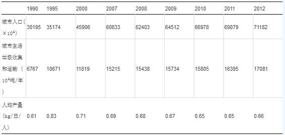 在過(guò)去20年間,中國(guó)城市生活垃圾產(chǎn)生量從1990年的6767萬(wàn)噸迅速增加至2010年的15805萬(wàn)噸。目前中國(guó)城市生活垃圾產(chǎn)生量為17080萬(wàn)噸,約占世界生活垃圾產(chǎn)生量的13%。表1顯示了從1990年到2012年中國(guó)城市生活垃圾收集和運(yùn)輸?shù)脑黾于厔?shì)。但與其他發(fā)達(dá)國(guó)家相比,中國(guó)一直被視為擁有相對(duì)較低人均生活垃圾產(chǎn)生量的國(guó)家。中國(guó)人均生活垃圾產(chǎn)生量0.66公斤/日,而發(fā)達(dá)國(guó)家人均生活垃圾產(chǎn)生量則在1-2公斤/日。