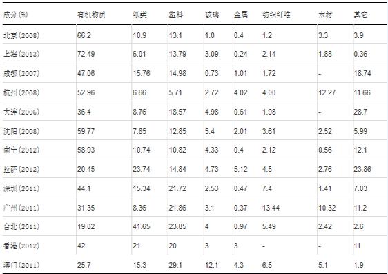 表3 中國(guó)幾個(gè)典型城市生活垃圾組成的比較