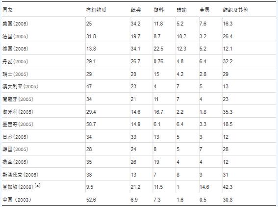 表2則比較了中國(guó)與其他經(jīng)濟(jì)組織國(guó)家的城市生活垃圾產(chǎn)生量。從表格可以看出中國(guó)總城市生活垃圾產(chǎn)生量居美國(guó)后,排第二,但垃圾每人每日產(chǎn)生量卻排在了倒數(shù)第一位。不同地區(qū)由于城市現(xiàn)代化程度、居民收入、消費(fèi)水平和生活習(xí)慣等因素影響,垃圾組分有所差別。表3比較了中國(guó)幾個(gè)城市的城市生活垃圾物理組成。中國(guó)城市生活垃圾主要由有機(jī)物質(zhì)組成,含水量率高。而這與中國(guó)人民習(xí)慣到肉菜市場(chǎng)挑選未經(jīng)加工、包裝的新鮮蔬菜和水果,習(xí)慣回家燒菜做飯有關(guān)。故在中國(guó),城市生活垃圾以食物殘?jiān)、菜葉等為主的廚房垃圾所占量最多,近似60%。相反,其它工業(yè)化國(guó)家城市生活垃圾含有更多的可回收利用資源,可生物降解的有機(jī)質(zhì)則較低。例如在西歐,紙類和塑料類所占比例較高。而這從表4也能得到應(yīng)證。