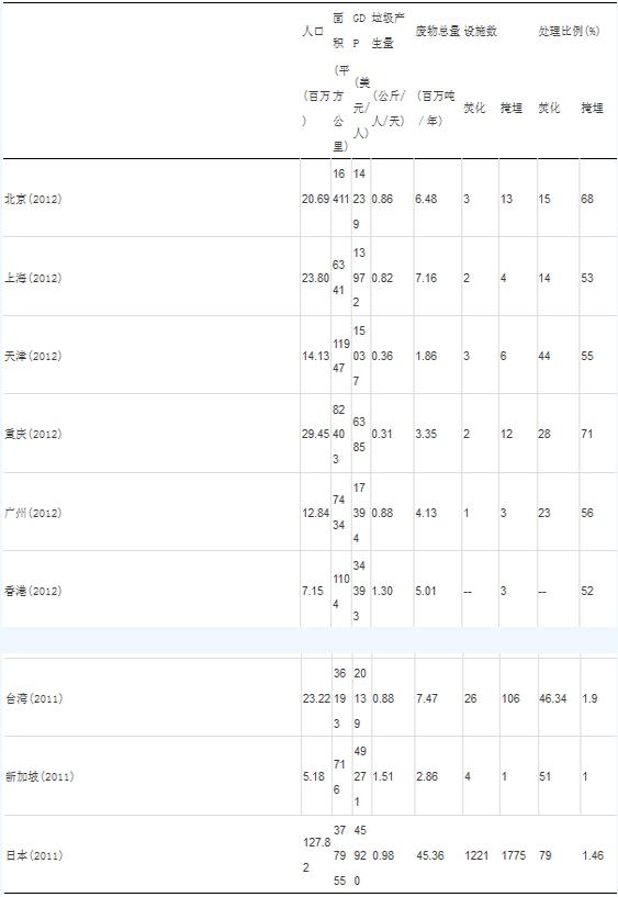 表6比較了亞洲國(guó)家大城市間的社會(huì)、經(jīng)濟(jì)和生活垃圾的管理情況。從圖表數(shù)據(jù)中我們可以看出:垃圾焚燒已成為國(guó)外發(fā)達(dá)國(guó)家處理城市垃圾,回收資源的一種主要方式。他們將垃圾作為一種重要能源,把焚燒產(chǎn)生的熱值用于發(fā)電,為城市供電。垃圾填埋后產(chǎn)生的填埋氣體也可作為鍋爐燃料,用于發(fā)電。然而,中國(guó)由于缺乏可靠的焚燒技術(shù),焚燒利用體系尚不完備,故資源轉(zhuǎn)換較發(fā)達(dá)國(guó)家相對(duì)較少。