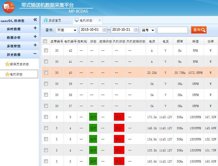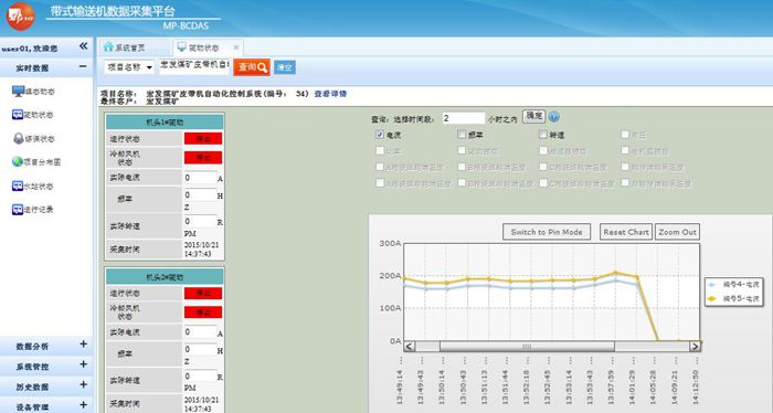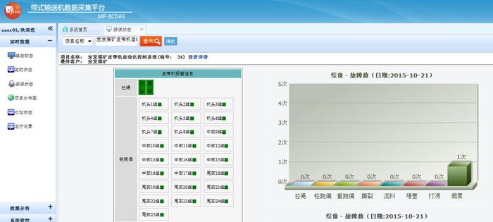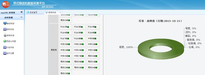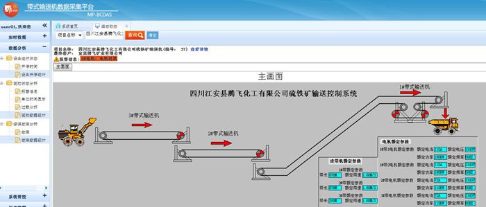 帶式輸送機(jī)數(shù)據(jù)采集平臺(tái)由現(xiàn)場(chǎng)工況顯示,實(shí)時(shí)數(shù)據(jù)采集,歷史數(shù)據(jù)分析三大部分構(gòu)成。在設(shè)備現(xiàn)場(chǎng),井口,井下等重要生產(chǎn)運(yùn)行地點(diǎn)分別安裝相關(guān)儀器、儀表,實(shí)現(xiàn)現(xiàn)場(chǎng)數(shù)據(jù)采集、重要數(shù)據(jù)存儲(chǔ)等功能;并通過(guò)專用網(wǎng)絡(luò),將現(xiàn)場(chǎng)采集的數(shù)據(jù)遠(yuǎn)程傳輸至監(jiān)控中心;在監(jiān)控中心的服務(wù)端,實(shí)現(xiàn)大數(shù)據(jù)的快速處理與分析。整個(gè)平臺(tái)的功能菜單包括現(xiàn)場(chǎng)組態(tài)顯示、數(shù)據(jù)采集、遠(yuǎn)程控制、數(shù)據(jù)存儲(chǔ)、數(shù)據(jù)分析、實(shí)時(shí)監(jiān)控、實(shí)時(shí)工況診斷、實(shí)時(shí)產(chǎn)量計(jì)算、生產(chǎn)報(bào)表等模塊,有效解決由于生產(chǎn)環(huán)境和信息滯后導(dǎo)致的效率問(wèn)題。