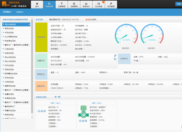 ——首頁(yè):由站點(diǎn)概覽、生產(chǎn)運(yùn)營(yíng)管理、設(shè)備維護(hù)管理組成;體現(xiàn)的是各站點(diǎn)正常還是故障、進(jìn)水壓力、出水壓力、站點(diǎn)流量、能耗對(duì)比、流量統(tǒng)計(jì)比較、能耗統(tǒng)計(jì)比較、設(shè)備運(yùn)行情況等。
